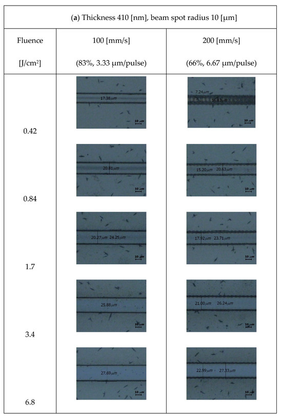 Figure 4 shows the optical microscopic images of a laser-patterned sample with a thickness of 410 nm. Laser beams with radii of 10 and 20 µm were applied under various fluences and overlap ratios. The images showed that the ablation linewidth increased as the fluence increased. Residues were found in the center of the ablated line for fluence below 1.7 J/cm2. Regarding beams of identical radii, the residues decreased as the overlap ratios increased.