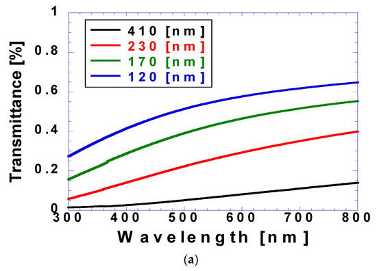 Figure 8 shows the measured transmittance and reflectance values with respect to coating thickness, with Figure 8a showing that the transmittance decreased with the increasing coating thickness and increased with the increasing wavelength. Specifically, the transmittance of the coating thickness of 120 nm varied from 27% at a wavelength of 300 nm to 65% at a wavelength of 800 nm. In contrast, the transmittance of the coating thickness of 800 nm varied from 1.5% at a wavelength of 300 nm to 14% at a wavelength of 800 nm. Figure 8b shows that unlike transmittance, reflectance (generally within 6–8%) was relatively independent of coating thickness and wavelength. However, the transmittances at coating thicknesses of 120 and 170 nm deviated from this range beyond wavelengths of 400 and 600 nm, respectively. However, the reflectance value was lower than 11%, and the deviations were negligible compared with those of the transmittance. With increasing coating thickness, the reflectance did not vary significantly, and the transmittance decreased, while the absorbance increased.