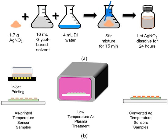 Schematic diagram of the temperature sensor fabrication steps: (a) ink preparation, (b) inkjet printing and plasma exposure.