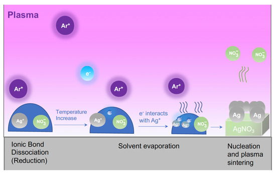 Figure 2 is a schematic diagram showing the plasma reduction steps associated with AgNO3/ethylene glycol [13]. During ink synthesis, AgNO3 dissolved in the glycol solvent dissociates into Ag+ and NO3– ions and remains so throughout the printing step. During plasma exposure, electrons in the plasma dissolve in the ink and become solvated, which in turn react with Ag+ ions to form neutral Ag atoms. Neutral Ag atoms react within the ink to form solid Ag nuclei. Eventually, Ag nuclei coalesce to form solid structures. In other words, the Ag atoms sinter and form a conductive network.