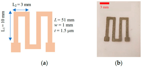 Figure 3 presents a schematic diagram and representative photograph of a printed RTD after plasma exposure. These sensors consist of a single printed Ag layer configured in a conventional serpentine geometry with contact pads on each end of the structure. The width, length, and thickness of the sensor are 1 mm, 51 mm, and 1.5 µm, respectively. To achieve the target thickness, a fully formed RTD was printed after a single print pass.