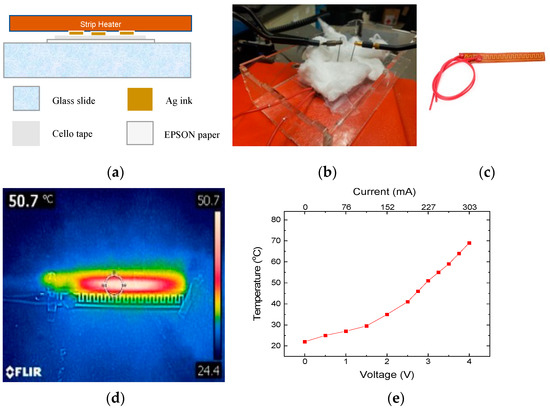 RTD testing: (a) Cross-sectional view of the testing setup. The temperature sensor was affixed to a glass slide. (b) Photograph of the custom-built rig, (c) Photograph of the flexible polyimide strip heater, (d) Thermal infrared image of the heater at ~51 °C, and (e) Temperature versus voltage profile for the strip heater.