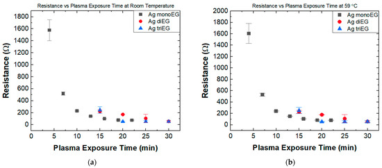 (a) Resistance versus plasma exposure time at room temperature for temperature sensors fabricated using the three EG inks; (b) Resistance versus plasma exposure time at 59 °C for temperature sensors fabricated using the three EG inks.