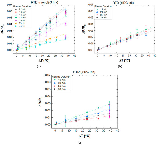 (a) Normalized change in resistance versus change in temperature for RTDs printed using the mono-EG ink. The plasma exposure time for each RTD is listed in the inset; (b) Normalized change in resistance versus change in temperature for RTDs printed using the di-EG ink. The plasma exposure time for each RTD is listed in the inset; (c) Normalized change in resistance versus change in temperature for RTDs printed using the tri-EG ink. The plasma exposure time for each RTD is listed in the inset.