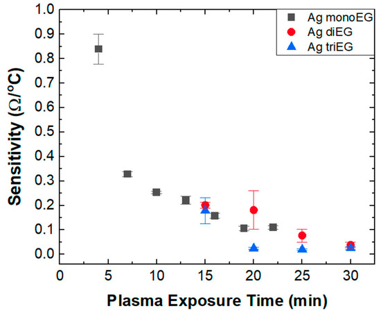 Unlike TCR, microstructure did not appear to influence the sensitivity of the RTDs, at least for the devices in the comparison set (plasma exposure time ≥ 15 min). In fact, the sensitivity decreased with increasing plasma exposure time regardless of ink solvent, with values grouped in a range between 0.2 and 0.03 Ω/°C. Figure 8 shows that the highest sensitivities were observed for RTDs printed with the mono-EG ink for plasma exposure times that lie outside of the comparison set (<15 min). This observation can be understood by examining the resistance associated with these structures. Because the formation of Ag in structures printed using the mono-EG ink favored 2D growth due to the high vapor pressure of mono-EG, very thin, continuous structures began to form at plasma exposure times as short as 4 min. These thin structures exhibit a high resistance due to their small cross-sectional area combined with elevated resistivity [11]. Additional plasma exposure causes the thickness of these structures to increase, thus increasing the cross-sectional area, reducing resistivity [11] and, therefore, reducing the overall resistance. Consequently, for the thinnest RTDs printed using the mono-EG ink, the high sensitivity was a result of the high resistance dominating over a modest TCR. For thicker structures, the reduction in resistance dominated over the increase in TCR, leading to the observed reduction in sensitivity. For long plasma exposure times, the sensitivity eventually saturated because both the TCR and resistance reached stable values because the Ag structures reached maximum thickness.
