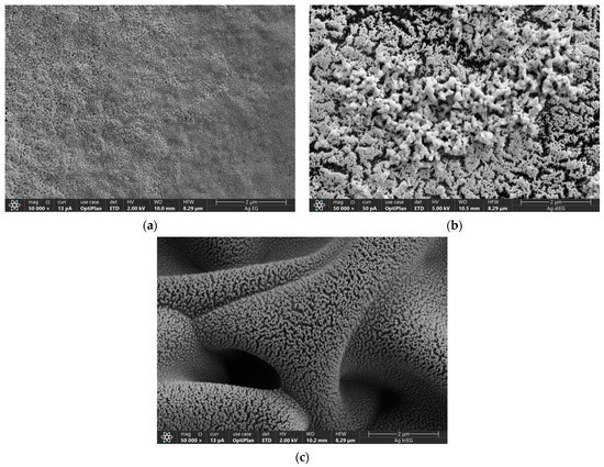 Plan-view scanning electron microscopy (SEM) using a Thermo Fisher Aprero 2 (Thermo Fisher Scientific, Waltham, MA, USA) was performed on a representative sensor printed using each ink to investigate the relationship between ink composition and the surface microstructure of each specimen. Previous work with these inks showed that plasma treatment led to the formation of polycrystalline Ag structures consisting of (111), (220), (220), and (311) grains [11].