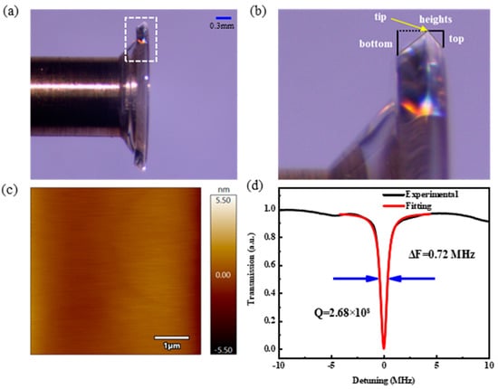 The process of preparing the CaF2 resonator is mainly divided into three steps, which are cleaning; gluing the resonator; and single-point diamond turning and polishing. In the first step, the resonator is cleaned with an ultrasonic cleaner to achieve a high degree of cleanliness on the resonator surface to ensure that the bonded resonator is stable. In the second step, a copper post is attached to the fixture and the surface of the copper post is coated evenly with UV glue. The knob on the top of the fixture was turned to move the copper post toward the resonator until it made contact, then it was irradiated with a UV lamp. The bonded resonator is well secured to the air-bearing spindle with a copper post. In the third step, the molding of the crystal resonator is completed by single-point diamond turning. However, some defects may exist on the surface of the crystal. By successively reducing the size of the polishing particles and smoothing the surface by fine polishing, the roughness of the crystal surface is improved. Through the above three processing steps, resonators with low surface roughness, transparent edges, and no scratch damage can be obtained, as shown in Figure 1a. We zoomed in on the region where the white box is located in Figure 1a and labeled the asymmetric V-shaped structure in this region. The yellow arrow points to the position of the “tip”, where the black solid lines represent the structure contour parameters “top”, “heights”, and “bottom”, as shown in Figure 1b. The surface topography was measured using atomic force microscopy (AFM) and the surface roughness, Ra = 0.484 nm, was calculated, as shown in Figure 1c. The surface roughness affects the quality of the resonator, and its optical quality factor is evaluated by measuring the line width of the coupling curve. The line width is 0.72 MHz, and the Q value of the crystal resonator is calculated to be 2.68 × 108. The red line is the Lorentzian fit, and the black line is the actually measured data, as shown in Figure 1d.