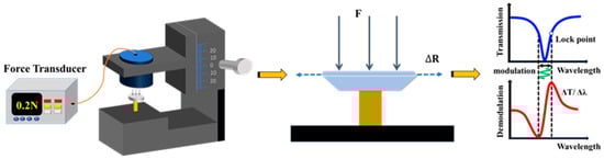 In recent years, force sensors have been widely used in automotive, aerospace industry, bioengineering, health-care, and other fields, leading to in-depth research. Force sensors based on a WGM resonator has the advantages of strong anti-interference ability, fast transmission rate, and high sensitivity, so it has been deeply studied. Several types of force microsensors based on WGM resonators have been reported. For example, A.L. Huston et al. [] first used WGM resonance to measure mechanical strain. In the study, a cylindrical resonator made of single-mode quartz fiber was used, with a Q value of 105. A WGM shift of ∼0.8 nm was observed at a strain of ∼58. Tindaro Ioppolo et al. [] reported a micro-optical force sensor based on a WGM resonator using PMMA fabricated into a 960 μm solid hollow sphere, achieving a Q of 106 with a detection sensitivity of 7.644 nm/N. K. Soler-Carracedo et al. [] reported on WGM force sensors made of oxyfluoride glass microspheres, pointing out the importance of the material’s thermal expansion and thermo-optical coefficient in sensor sensitivity. Y.E. Geints et al. [] reported a proof-of-concept for a miniature force sensor based on dielectric microspheres coupled to optical field excitation, which has the important advantage of miniaturizing the design, with the force-sensitive element not being in mechanical contact with the WGM resonator.