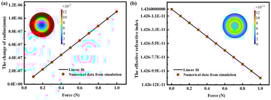 The finite element method (FEM) was used to simulate the radius and refractive index variations of asymmetric V-shaped CaF2 resonators at different forces. The basic properties of the material are as follows: density is 3.18 g/cm−3, Young’s modulus is 75.8 Gpa, and Poisson’s ratio is 0.26. The diameter is 4 mm and the thickness is 0.3 mm. The first influencing factor is the variation of the radius; in the force sensing system, the light is coupled to the CaF2 resonator and circulates along the circumference, so we choose the variation of the outermost radius. As shown in Figure 3a, the variation of the CaF2 resonator radius at different forces has a good linear relationship with a slope of 1.07 × 10−6 mm/N. The inset shows the effect of a force of 1 N on the variation of the CaF2 resonator radius. Another influencing factor is the change in refractive index. The change in refractive index due to the stress in the CaF2 resonator is given by the following equation: