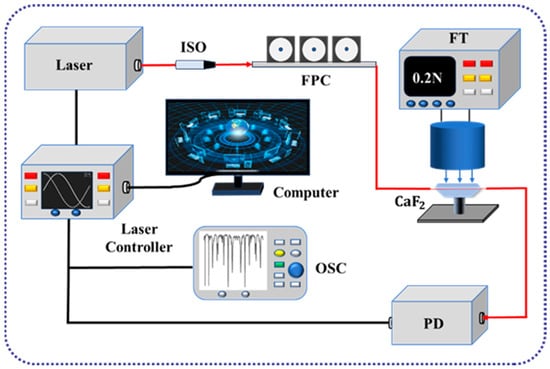 The experimental setup for the force sensing system is shown in Figure 4. A tunable laser with a linewidth of 10 kHz was used and was tuned to the 1550 nm band. Light is generated by the tunable laser and output through the isolator. The output light passing through the isolator is not reflected back to the laser, which has a protective effect on the laser. The output light is coupled to the CaF2 resonator via a tapered fiber, and the coupling strength is optimized using a polarization controller (PC). The coupled output light is connected to a photodetector (PD) through an intensity-adjustable attenuator, and the electrical signal output from the photodetector is transmitted to an oscilloscope (OSC) for signal display and response.