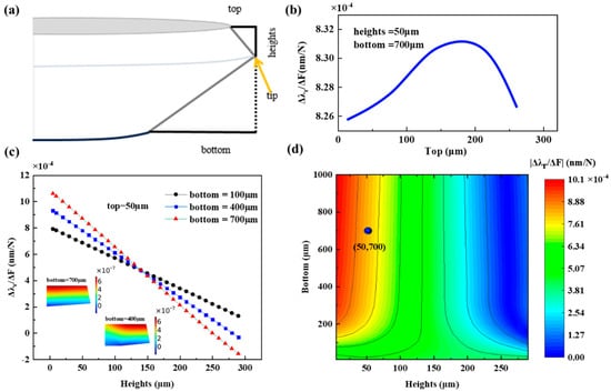 From the above two simulation results, it can be seen that in the asymmetric V-shaped structure of the CaF2 resonator, the effect of top on Δλr/ΔF is extremely small; heights and bottom have good linear relationships with Δλr/ΔF, which clearly demonstrates the influence of the three parameters on the performance of the CaF2 resonator. In order to find the optimal combination of parameters to improve the efficiency of force sensing, we fix the parameter top = 50 µm and simulated the values of the other two parameters to obtain the function of |Δλr/ΔF| on heights and bottom. The simulation results show that |Δλr/ΔF| is larger when heights is smaller and the bottom is larger, as shown in Figure 5d.
