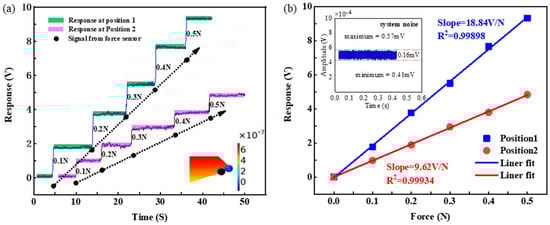 Considering the distribution of the optical mode field and the limitations of the resonator preparation process, we finally made the profile parameters of the resonator V-shaped structure as top = 50 µm, heights = 50 µm, and bottom = 700 µm, respectively, as shown by the blue sphere in Figure 5d. The force-sensing efficiency at the tip of the V-shaped structure of this resonator is simulated to be Δλr/ΔF = 8.28 × 10−4 nm/N. An experimental validation was performed to test an asymmetric V-shaped CaF2 resonator as a force-sensing element, in which a pressurized device was used to apply force to the resonator. We experimentally measured at two positions under this structure, recording several values of applied force and the corresponding voltage responses. As shown in Figure 6a, the resonator was continuously pressurized with the applied force ranging from 0.1 N to 0.5 N, and the experimental results of applying incremental force in 0.1 N increments were tested; it was observed that the WGM resonator variations exhibited a voltage output response that showed a step change trend with increasing force, and the voltage output response time is short in the test load range, thus providing reliable force readings that are important to the performance of the sensor. Position 1 is at the tip of the asymmetric V-shaped structure and position 2 is slightly downward of the tip, as shown in the inset of Figure 6a. We measured the voltage output response at two positions under different forces. The two positions have almost the same Q factor, but the response at position 1 is significantly stronger than that at position 2. The corresponding voltage output response as a function of applied force is plotted as shown in Figure 6b, which is obtained by linear fitting with a slope of 18.84 V/N and a goodness of fit r2 = 0.99898 at position 1, and a slope of 9.62 V/N and an r2 = 0.99934 at position 2. The sensitivity at position 1 is 1.96 times that at position 2. It shows that the design of the asymmetric V-shaped structure can improve the sensitivity of force sensing. It is important to note that for all force measurements discussed here, the temperature of the environment surrounding the sensing system is kept constant to avoid additional effects of temperature variations on the output response. In addition, sensor sensitivity is not the only measure of the device’s detection capability; to fully characterize the sensor’s performance, we also need to know the sensor’s detection limit. For the force sensing we are investigating, the detection limit represents the smallest change in external force that can be detected. As shown in the inset of Figure 6b, the noise of the system without an applied external force is demonstrated with a noise amplitude of 0.16 mV. By calculation, the minimum detectable force is 8.49 µN with a system sensitivity of 18.84 V/N.