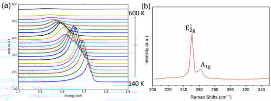 (a) Renormalized PL spectra of 1L WSe2 from 140 K to 600 K, at a photon energy range from 1.4 eV to 1.9 eV. (b) The Raman spectrum of monolayer WSe2.