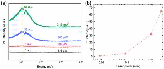 (a) The power-dependent PL spectra at 8.6 μW, 86 μW, 860 μW, and 2.15 mW, respectively. (b) The power-dependent PL intensity at about 1.65 eV.