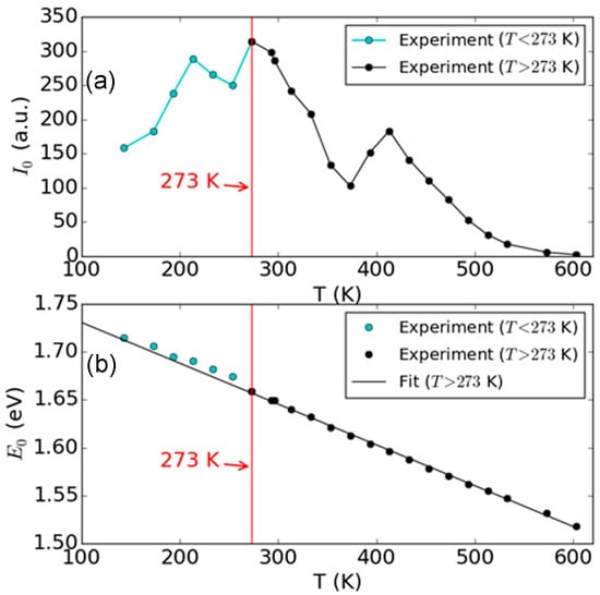 We now discuss the temperature evolution of I0 and E0 in Figure 3. In Figure 3a, I0 increases with temperature for T < 273 K, which is attributed to the change from an indirect band gap to a direct band gap. For T > 273 K, I0 decreases with temperature. This is mainly due to the increased relaxation rate of electrons during their scattering with lattice, which will determine the population of electrons at the CBM and the holes at the VBM during the excitation relaxation process. The excited electron hole pairs can annihilate by scattering with the lattice, and the energy will be relaxed to the lattice without emitting a photon. In Figure 3b, the deviation of E0 in the low temperature regime (cyan circles) from the linear extrapolation is likely due to the flattened band structure when the direct gap and the indirect band gap energies degenerate and the resulting change in density of states. This may lead to more electronic states slightly higher than the CBM and create photon emissions with a larger energy. This observation is different from prior PL reports of 1L-WSe2, where a monotonic increase in PL intensity was measured as the temperature was decreased [32,33]. We attribute the difference to a better sample quality in our case, which quantitatively matches with the DFT calculation for the temperature boundary of direct-to-indirect bandgap transition.