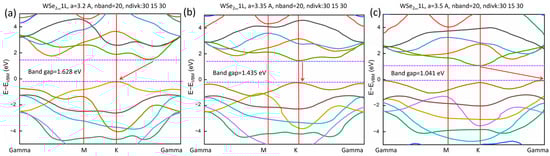 DFT-calculated band structure for 1L WSe2 with different lattice parameters. (a) a = 3.2 A, corresponding to indirect band gap with K Γ to K relaxation, (b) a = 3.35 A, corresponding to the direct band gap with K to K relaxation, and (c) a = 3.5 A, corresponding to indirect band gap with K to Γ relaxation. The band gaps are (a) 1.628 eV, (b) 1.435 eV, and (c) 1.041 eV.