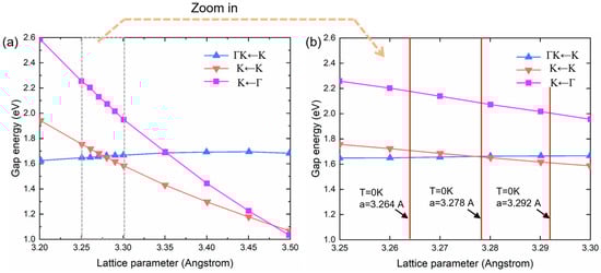 Figure 5 summarizes the band gap energy for the three different scenarios from Figure 4 as a function of the lattice parameter a from 3.2 to 3.5 Angstrom. The main feature happens between a = 3.25 Anstrom and a = 3.3 Angstrom, where the evolution of the direct band gap PL from K to K point intersects with the indirect band gap PL from Γ K to K point, with the intersection taking place at a = 3.277 Angstrom. In order to identify their corresponding temperatures, we take the room temperature lattice parameter of WSe2 as a0 = 3.278 A [37]. For the thermal expansion of WSe2, we take the X-ray diffraction data from Ref. [38] as , with a in Angstrom and T in Kelvin. In Figure 5b, we mark the three characteristic lattice parameters at different temperatures: a = 3.264 Angstrom corresponding to T = 0 K, 3.278 Angstrom corresponding to T = 300 K, and 3.292 Angstrom corresponding to T = 600 K. The lattice parameter at 300 K agrees well with the intersection of the Γ K to K gap and the K to K gap, meaning that the direct-to-indirect gap transition will happen at around the room temperature. This prediction agrees well with the experimental observations in Figure 3, and will serve as a quantitative support of this main conclusion in the work.
