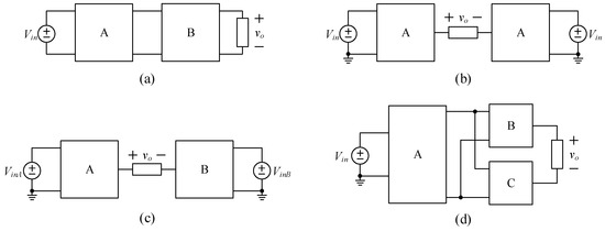 As shown in Figure 1, considering the development cost and component selection of multilevel inverters, the output voltage quality can be improved through several modular circuits. This figure discusses four ways to increase the number of voltage levels of multilevel inverters. Circuits A, B, and C can be multilevel inverters, half-bridge or full-bridge circuits composed of switches or switched-capacitor circuits composed of capacitors and switches.