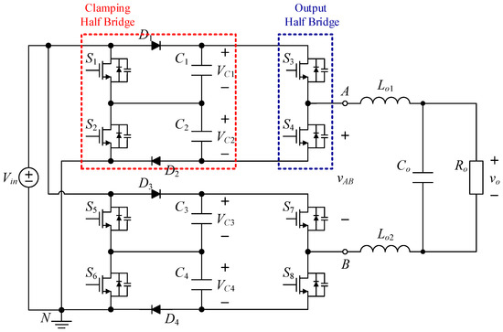 The proposed single-phase seven-level symmetric switched-capacitor DC–AC converter is constructed using the concept of two double voltage clamping circuits connected to individual half-bridge circuits. As shown in Figure 2, the output of the half-bridge circuit consisting of two power switches is connected to the load side, which is called the output half bridge; similarly, the double voltage clamping circuit is composed of the half-bridge circuit consisting of two diodes, two capacitors and two power switches, which is called the clamping half bridge.