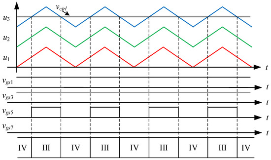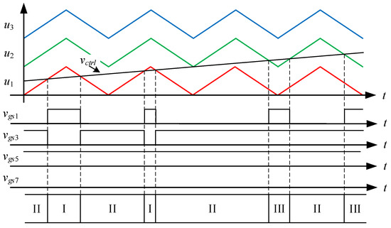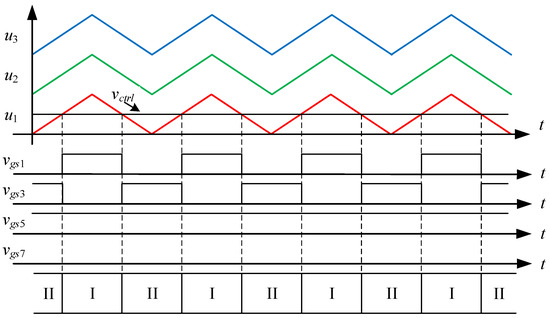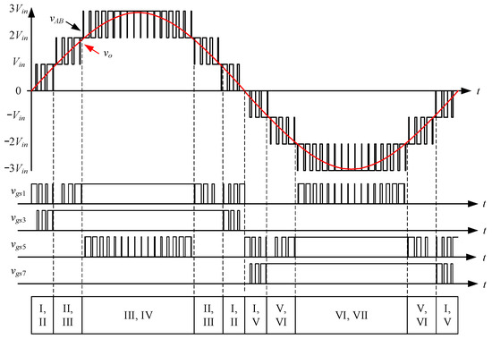 Figure 3 shows the driving signal waveforms for the switches. There are seven states of circuit behavior which correspond to the seven levels of the voltage output. Among them, vgs1 to vgs8 are the driving signals for the switches S1 to S8, respectively. As the voltage output operates at a positive half-cycle, the converter operating between states I and II is mainly performed by the switch S3 to carry out PWM switching to build up the first voltage level, and at this time, the switch S1 is driven by the complementary signal of S3, and the switches S5 and S7 are kept at normal cutoff; the converter operating between states II and III is mainly performed by the switch S1 to carry out PWM switching to establish the second voltage level, and at this time, the switch S3 is kept at normal conduction, while the switches S5 and S7 are kept at normal cutoff; the converter operating between states III and IV is mainly performed by the switch S5, and the same arm switch is driven by inverting the PWM switching of the switch S5 to establish the third voltage level, and at this time, the switches S1 and S3 are kept at normal conduction, while switch S7 is kept at normal cutoff.