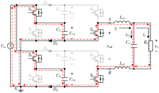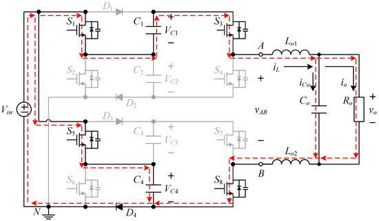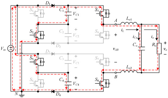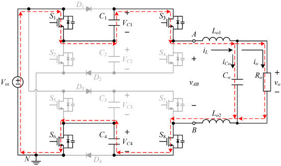 State I. [0 < vctrl < u1]: as shown in Figure 4, the control force vctrl, together with triangular waveforms u1, u2, and u3 performs LS-PWM. When the control force vctrl is located between 0 and the triangular waveform u1, the converter enters into state I, as shown in Figure 5. Since the switches S1, S4, S5, and S8 are on and the switches S2, S3, S6, and S7 are off, the current iL flowing through inductors Lo1, Lo2 forms a loop from the input voltage Vin through the switches S1, S4, S5, S8, the capacitor C2, and the diode D4. Therefore, the voltage between points A and B is zero, i.e., vAB = 0.