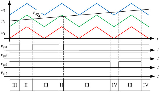 From Figure 4, Figure 6, Figure 8 and Figure 10, it is clear that there are three switching modes when the output voltage operates at a positive half-cycle. The control force vctrl is compared with the triangular wave u1 to make the converter switch between states I and II, and the corresponding duty cycle in state II is Da; the control force vctrl is compared with the triangular wave u2 to make the converter switch between states II and III, and the corresponding duty cycle in state III is Db; and the control force vctrl is compared with the triangular wave u3 to make the converter switch between states III and IV, and the corresponding duty cycle in state IV is Dc. Hence, the associated equations for the duty cycles Da, Db and Dc are shown below:
