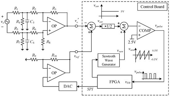 Figure 14 shows how the voltage sampling circuit uses a voltage divider, a differential amplifier, a non-inverting amplifier, and a digital-to-analog converter (DAC). The small voltage signal is first divided by the voltage divider consisting of resistors R1, R4, R5, and R7 for the output voltage vo, and capacitors C5 and C6 are added to filter out the high-frequency noise, and then sent to the differential amplifier consisting of resistors R2, R3, R6, and R8 for the second division. The reference voltage vref is amplified by a non-inverting amplifier consisting of resistors R9 and R10 to amplify the analog signal from the digital-to-analog converter (DAC). Since the sampling voltage range of the no ADC sampling technique [31] is located between 4 V and 6 V, the reference voltage vref is subtracted from the small voltage signal to obtain the sampling signal verr, which is then added with a sawtooth voltage vsaw and a 2.5 V DC voltage, and then passed through a comparator to generate a pulse signal vpulse. Afterward, this signal is sent to the FPGA controller to be converted into a signal vFB.