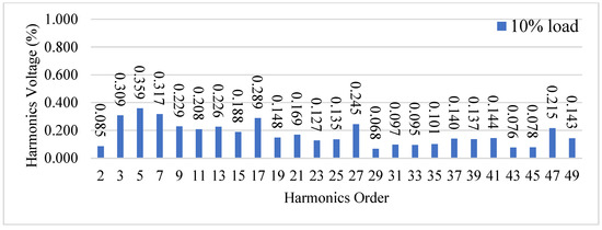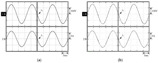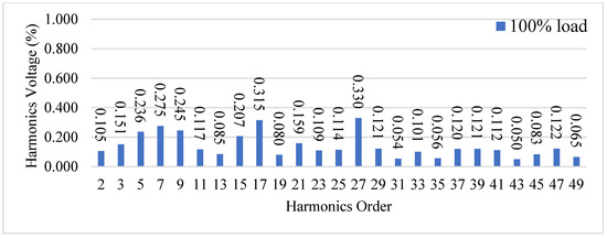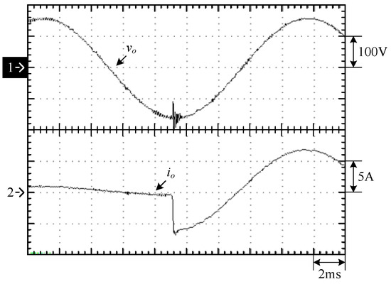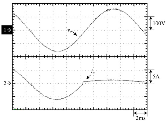 Figure 23 shows the waveforms of the output voltage vo and output current io from the 10% load to 100% load. Figure 24 shows the waveforms of the output voltage vo and output current io from 100% load to 10% load. Figure 23 shows that when the output voltage is close to the peak of the negative half-cycle, the output voltage and current can still be stabilized after uploading, and the corresponding recovery time is about 1 ms, and the corresponding output voltage drops by about 50 V due to a larger change in the output current. Figure 24 shows when the output voltage is close to the zero-crossing point, vo and io can be stabilized from 100% load to 10% load. Since io has a smaller variation, a change in vo is less clear. In addition, Figure 25 shows the output voltage harmonics under 100% load, whereas Figure 26 shows the output voltage harmonics under 10% load.