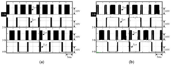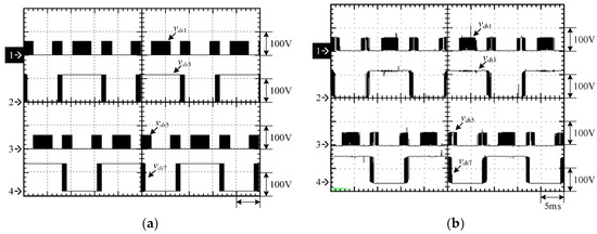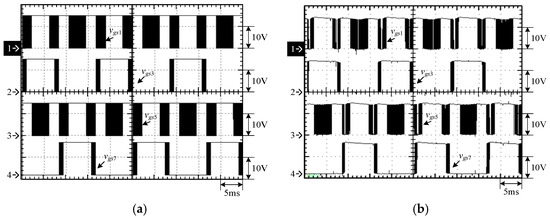 Gate driving signals for S1, S3, S5, and S7 under 100% load: (1) vgs1; (2) vgs3; (3) vgs5; and (4) vgs7. (a) Simulated waveforms, (b) Experimental waveforms.