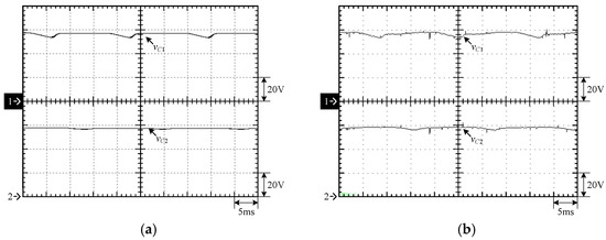 Voltages on C1 and C2 under 100% load: (1) vC1; (2) vC2. (a) Simulated waveforms, (b) Experimental waveforms.