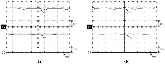 Voltages on C3 and C4 under 100% load: (1) vC3; (2) vC4. (a) Simulated waveforms, (b) Experimental waveforms.