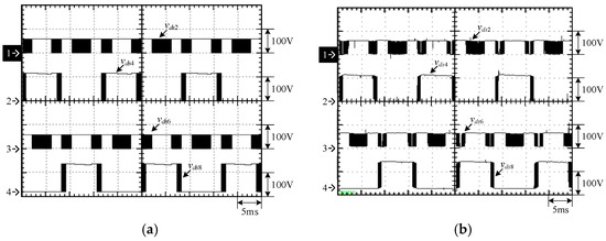 Gate driving signals for S2, S4, S6, and S8 under 100% load: (1) vgs2; (2) vgs4; (3) vgs6; and (4) vgs8. (a) Simulated waveforms, (b) Experimental waveforms.