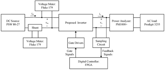 Figure 27 shows the efficiency measurement method, where the current detection resistor (Shunt) is used to obtain the input current; two digital meters (Fluke179) are used to detect the voltage on the current detection resistor and to obtain the average value of the input current and the average value of the input voltage. Accordingly, the corresponding average input power can be calculated. In addition, an AC electronic load (Prodigit 3255) is utilized on the load side, and a power analyzer (PM1000+) is adopted to measure the output current, voltage, average output power, total harmonic distortion, and harmonic magnitude of each order. Finally, the resulting input and output powers are employed to calculate the efficiency of the actual circuit operation.