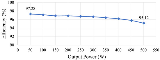 Figure 28 shows the efficiency curve of the proposed circuit. From this figure, the maximum efficiency of the proposed circuit is 97.28%, and the minimum efficiency is 95.11%. Since the converter is constructed using two double voltage clamping circuits connected symmetrically, the switches have low-voltage stress. As a result, the switches are characterized by low-voltage stress for better switching features. However, the circuit needs to store and release energy through the clamping capacitors to achieve a high-voltage gain. Consequently, the series of parasitic resistance (ESR) leads to additional energy loss during the operation period, resulting in a negative correlation between efficiency and output power, i.e., the higher the output power is, the lower the efficiency.