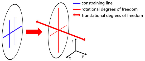 The FACT method is a useful tool for visualizing the constraint space by mapping it to the degree of freedom (DOF) space. This method is described in several articles, including [12,13,14,15,16,17,18]. The resulting visualization is shown in Figure 3. By applying the principle of FACT, we can deduce that if our mechanism has a freedom space as shown in Figure 3, then it must also have a constraint space as shown in Figure 3 [13].