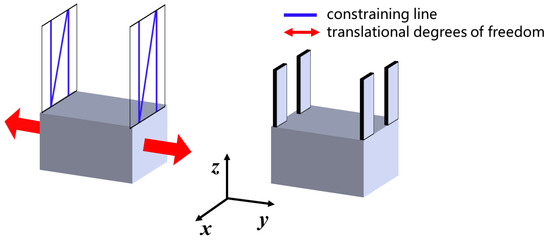 where represents the thickness of the beam. In the vertical direction, the two cross-axis flexural pivots are connected in parallel, resulting in a vertical stiffness of for the cross-axis flexural pivot. Furthermore, the cross-axis flexural pivot, the compliant translation module, and the base are connected in series. Therefore, the formula for calculating the vertical stiffness of the entire mechanism is:
