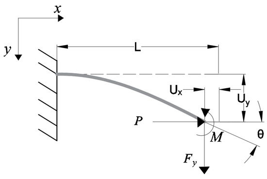 Due to the challenges in achieving accurate modeling using the rigid body model (RBM), the beam constraint model (BCM) is often used to complete the modeling of bending-compliant parts [25]. In the compliant translation module, we used BCM to complete the construction. For example, we can examine the stress diagram of an ordinary beam in Figure 8 and obtain the equations for the beam’s displacements and loads as shown in Equation (1):
