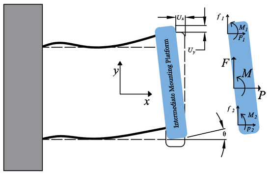 We are using a support plate, so we replace the plate modulus with Young’s modulus. To obtain the load–displacement equation of the platform, we use the equilibrium relation of the force and moment of the middle installation platform. This results in three equilibrium equations, which are connected with the equation of the deformation geometric relation of the beam. Finally, we solve these equations to obtain the load–displacement equation of the platform: