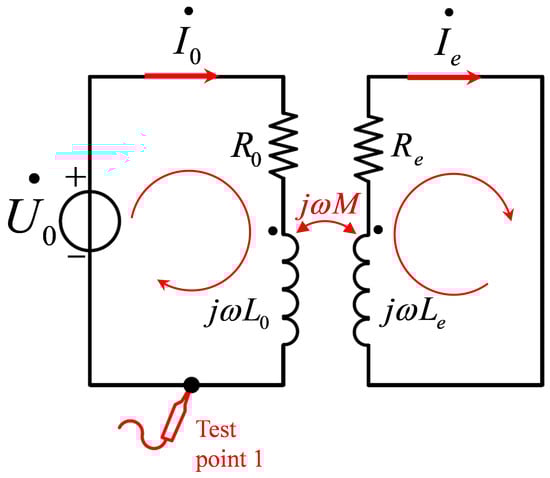 Figure 3 illustrates the coil–test object interaction based on the transformer model: represents the harmonic excitation at angular frequency ; represents the impedance of the excitation coil; denotes the inductive reactance of the excitation coil; represents the impedance of the test object; denotes the inductive reactance of the test object; and M represents the mutual inductance coefficient between the excitation coil and the test object. Based on the principles of magnetic coupling and mutual inductance between coils, the current in the excitation coil generates an equivalent current of magnitude on the test object (in the same direction as ), while the induced current on the surface of the test object, in turn, affects the excitation coil, producing an equivalent current effect (in the same direction as ).