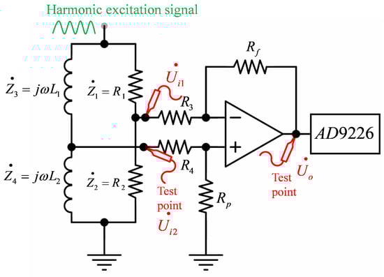 When the harmonic excitation passes through the differential coils, it causes the impedance of the bridge to change due to defect information on the surface of the test object, resulting in an unbalanced condition that outputs a differential signal. Considering that the bridge output signal is small and may contain substantial common-mode noise, it is necessary to amplify the bridge output signal using an instrumentation amplifier before it can be acquired by the AD converter.