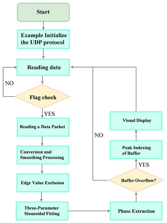 This paper describes the creation of a UDP port and data processing program in MATLAB to manage data transmitted from the lower computer to the host computer via the Ethernet UDP protocol, as illustrated in Figure 7. The program’s basic functions and main processes include receiving and converting data sent from the lower computer and eliminating outlier signals at the edges. The converted result is the detection signal containing defect information. The detection signal undergoes low-pass filtering through a moving-average process, and the smoothed signal is then analyzed using a three-parameter least-squares sinusoidal fitting algorithm to extract amplitude and phase information. Finally, the host computer visualizes the transformed amplitude and phase information to facilitate a more intuitive analysis of the defects on the surface of the test object.