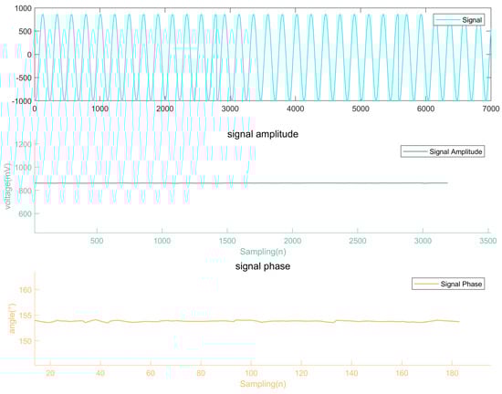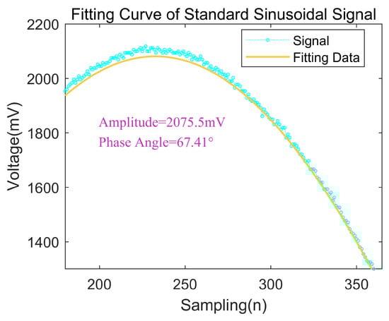 Sinusoidal fitting allows for the determination of the amplitude of the sampled signal. For a standard sinusoidal excitation signal input, the three-parameter sinusoidal fitting implemented in MATLAB is illustrated in Figure 8. The fitting results meet the basic requirements of digital demodulation and enable the extraction of information on the signal’s amplitude and phase angle.