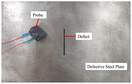 To verify the performance of the designed system and its digital demodulation algorithm, this study tests and analyzes a steel plate with identified surface defects. As illustrated in Figure 9, the steel plate has a defect that is 1 mm wide, 250 mm long, and 1 mm deep. The experiment assesses the system’s performance via the real-time dynamic detection of this specific defect.