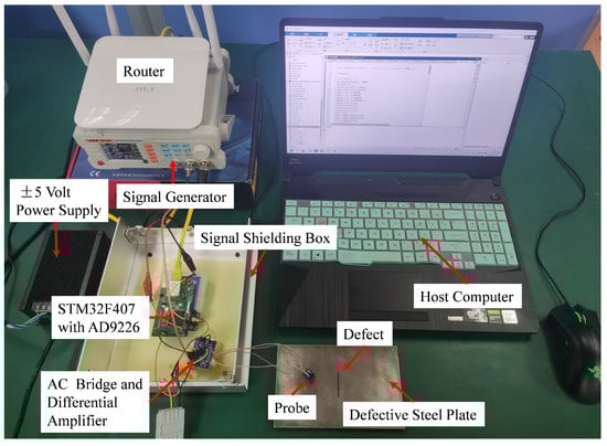 As shown in Figure 10, the experimental test platform comprises an STM32F407 controller with an AD9226, a detection amplification circuit comprising an bridge and differential amplifier, a signal shielding box, a regulated -volt power supply, a router, a signal generator, a host computer, the defective steel plate under test, and an eddy current detection probe.