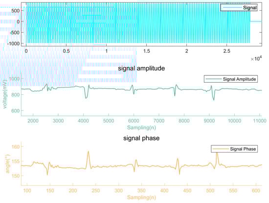 Here, A represents the amplitude of the detection signal; f is the frequency of the output signal, which remains consistent with the frequency of the input signal and is a known quantity; is the phase angle of the output signal; and C is the DC offset of the output signal, which, theoretically, is very small. For the eddy current detection system, the useful characteristic signals that need to be extracted and analyzed are the signal amplitude A and the output phase angle .