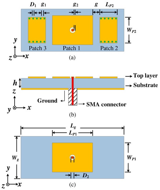 The configurations of the proposed Ant. 1. (a) Top view, (b) cross-section view, (c) top view of the single patch antenna.