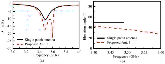 The simulated (a) |S11| and (b) the elevation angles of the proposed Ant. 1 and the single patch antenna within their respective operating bandwidth.
