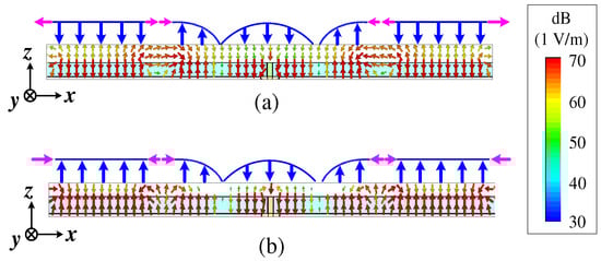 Figure 3 shows the simulated vector’s electric field distribution of the proposed Ant. 1. It is clear that the internal electric field distribution of Patch 1 was on TM20 mode: the electric field was a full-wave distribution in the x direction, while, in the y direction, the direction of the electric field was the same and the amplitude was equal. The internal electric field distribution of Patch 2 and Patch 3 was on TM01 mode, the direction of the electric field was the same and the amplitude was equal in the x direction, while the electric field exhibited a half-wave distribution in the y direction. The horizontal components of the electric field of the TM20 mode on both sides of Patch 1 had equal amplitudes and opposite directions, so the far-field radiation pattern was offset from the broadside but superimposed along the endfire direction, which can generate the symmetrical dual-beam radiation. The internal electric field of the TM01 mode was of equal amplitude and in the same direction, the horizontal electric field components on the left and right sides of Patch 2 and Patch 3 had equal amplitudes and a phase difference of 180°, which can maintain the bidirectional radiation of the proposed Ant. 1. Meanwhile, two reflection zeros were formed due to the coupling of the TM20 mode with the TM01 mode, a phenomenon which is consistent with the simulation results in Figure 2a. At the first reflection zero (Figure 3a), the electric field of the two modes was almost reversed (blue arrow), and the electric field amplitude of the TM01 mode was smaller than that of the TM20 mode. The direction of the horizontal components of the electric field near two adjacent resonators was similar (pink arrow). At the second reflection zero (Figure 3b), the electric field of the two modes was similar, and the electric field amplitude of the TM01 mode was equal to that of the TM20 mode. The direction of the horizontal components of the electric field near two adjacent resonators was reversed. The change of coupling with the frequency resulted in the change of the elevation angle, confirming the results in Figure 2b.