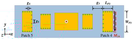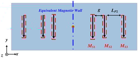 According to the antenna radiation theory [], the radiation pattern of a patch antenna can be equivalent to the radiation superposition of the magnetic currents in two slots located along two radiation edges of the patch. Thus, the proposed Ant. 1 can be equivalent to six magnetic current sources, as shown in Figure 4. Meanwhile, the whole antenna is center-symmetric, and the central plane is equivalent to a magnetic wall, so that the far-field electric field of the right half part can be calculated using a three-element slots array, expressed as MS1, MS2, and MS3. The distances separating the three adjacent slots are g and LP2. Hence, the far-field electric field radiated by MS1, MS2, and MS3 can be expressed as:
