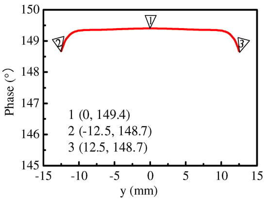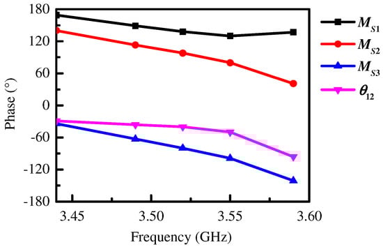 The simulated phase difference θ12 between MS2 and MS1 is also given in Figure 5. Here, the phase of the equivalent magnetic current was calculated by the midpoint of the corresponding slot width in the simulation because the phase distribution along the slot width was uniform, as shown in Figure 7. We can see that the value of θ12 was in the range of −180° < θ12 < 0°, indicating that Patch 2 played the role of director. Similarly, we can conclude that Patch 3 also acted as a director, causing the dual beams of the proposed Ant. 1 to be tilted toward the endfire direction at the same time and the elevation angle of the proposed Ant. 1 to be reduced. Furthermore, the elevation angle was reduced in the operating bandwidth because the value of θ12 decreased with increasing frequency. The simulation results in Figure 2b are consistent with the above analysis.